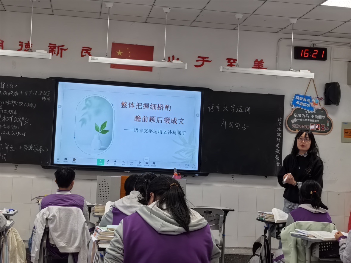 牟老师从补写句子的方法入手,带领学生一步步解析,然后进行练习巩固,帮助学生掌握高考中补写句子的基本方法。在教学过程中,注重学生的主体地位,激发学生的思维和创造力,使他们能够积极参与到文学作品的学习中来,从而提高他们的文学修养和综合能力。牟老师能够熟练使用希沃白板等多媒体功能,课堂设计富于活力,课堂效果良好。