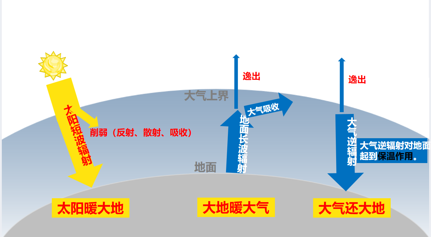 (1)大气对太阳辐射的削弱作用:吸收、反射、散射 (2)大气对地面的保温作用:保温过程、表现、现象。 (3)分析农业实践中的一些现象:①利用温室大棚生产反季节蔬菜。②)深秋农民利用燃烧秸秆制造烟雾预防霜冻。③华北地区早春农民利用地膜覆盖进行农作物种植。)④干旱半干旱地区果园中铺沙或鹅卵石,不但能防止土壤水分蒸发,还能增加昼夜温差,有利于水果的糖分积累等。 (4)昼夜温差大小的分析 ①阴天比晴天日温差小的原因②塔里木盆地昼夜温差大的原因③青藏高原日温差大的原因 (5)影响太阳辐射多少(大气削弱作用)的因素:纬度、地形、天气状况、昼夜长短、大气透明度 二、理论学习