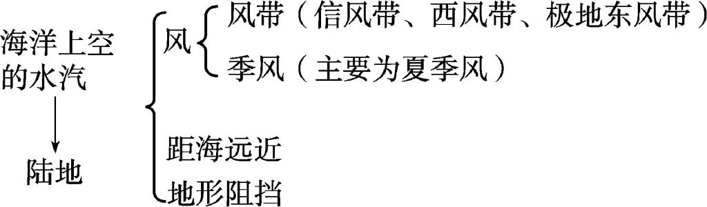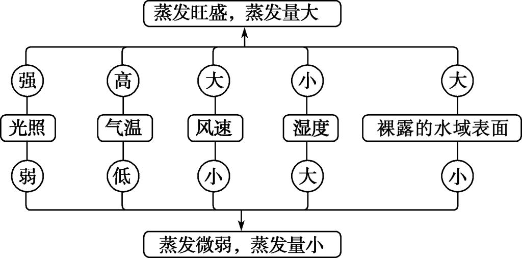 2. 影响水循环各环节的自然因素 (1) 影响蒸发的因素  (2) 影响水汽输送的因素——风  (3) 影响降水的因素  (4) 影响地表径流的因素