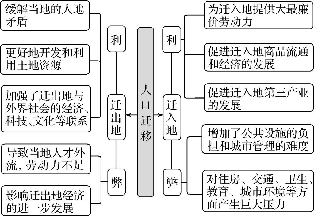 1. 人地协调观:结合实例,解释人口迁移的影响 2. 综合思维:结合人口迁移资料,分析不同地区人口迁移的影响因素 3. 区域认知:结合人口迁移资料,分析不同地区人口迁移的特点 4. 地理实践力:组织学生进行当地人口流动或迁移情况调查 |